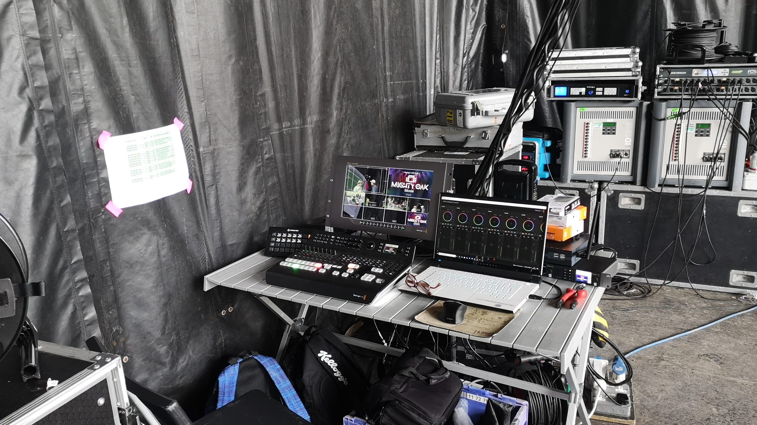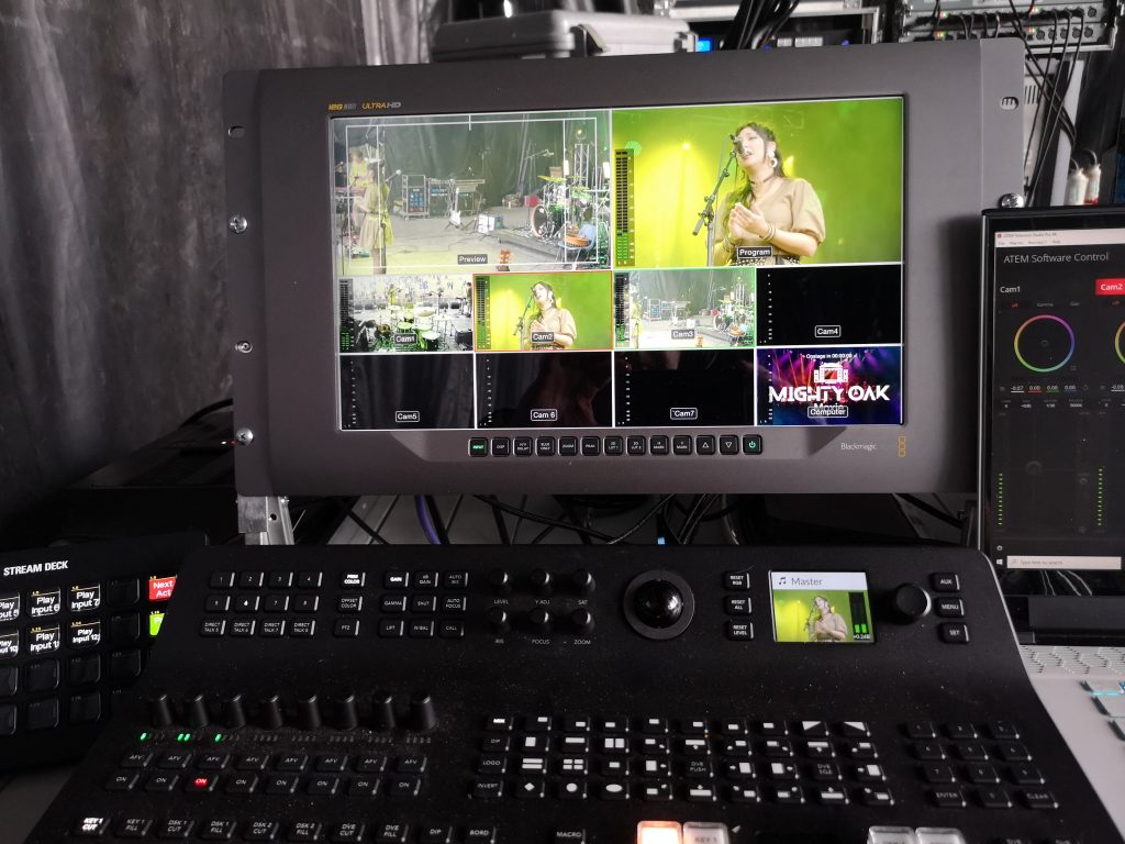 I was switching from 6 camera angles. 2 live camera positions and 4 fixed cameras. I was able to communicate with the camera ops to get the shots I needed, but they were also able to re-adjust some of the the fixed cameras, as the gig progressed. We used Blackmagic equipment throughout, with the final mix through the Blackmagic Production Mixer. Graphics and titles were pre-pared and selected through a Laptop & Stream-deck. Lighting and sound were provided by the festival. My station was backstage and boy was it loud ! Keeping the cans on provided some protection.